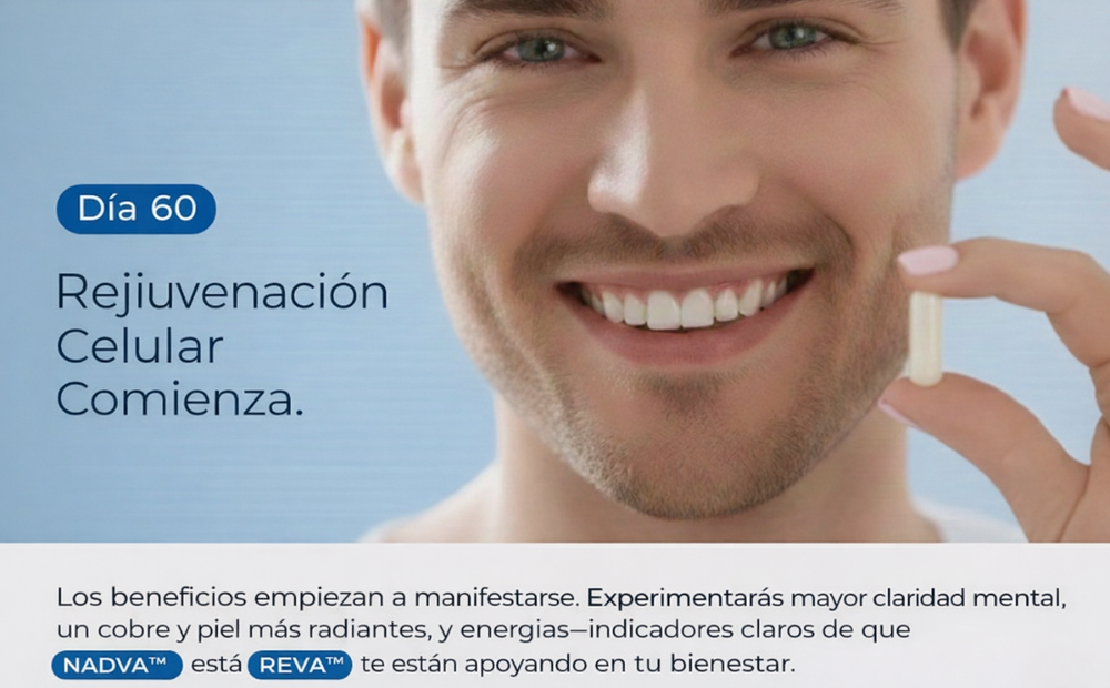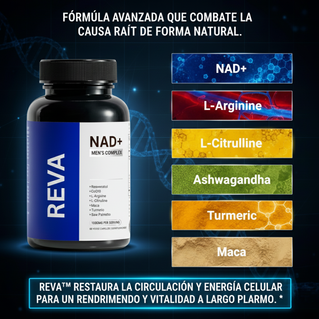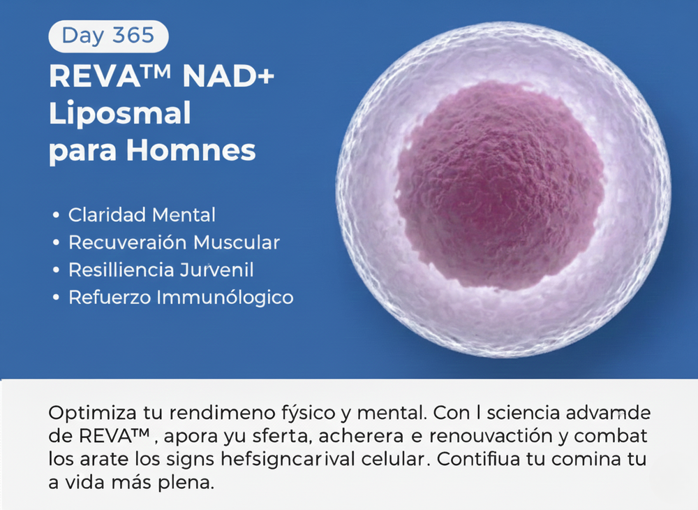 Los niveles de NAD+ disminuyen drásticamente con la edad, afectando tu energía y recuperación. A partir de los 30 años, tu cuerpo pierde el "combustible" esencial para mantenerse joven. REVA™ NAD+ Liposomal restaura esa vitalidad perdida con máxima absorción.REVA™ NAD+ Liposomal para HombresREVA™ NAD+ Liposomal | Detén el Envejecimiento Celular Recupera los niveles de NAD+ que el tiempo te quita. Energía, enfoque y vitalidad masculina con tecnología liposomal avanzada.